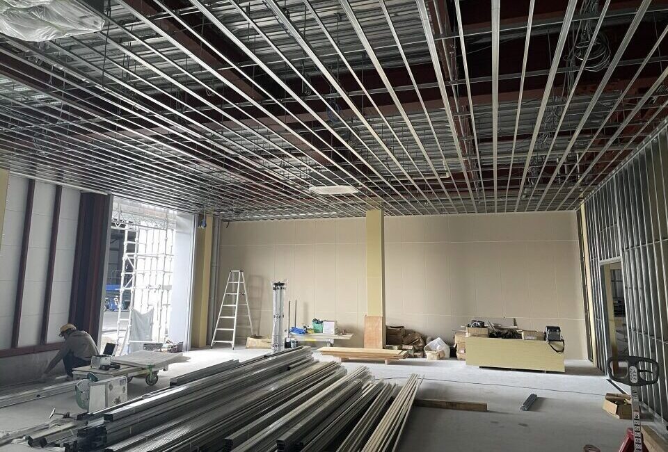 鋼製下地(LGS)工事は、建物の壁や天井の骨組みを軽量鉄骨で組み上げる工事です。石膏ボードなどの仕上げ材を取り付けるための重要な下地となり、建物の精度や仕上がりを左右する大切な工程です。